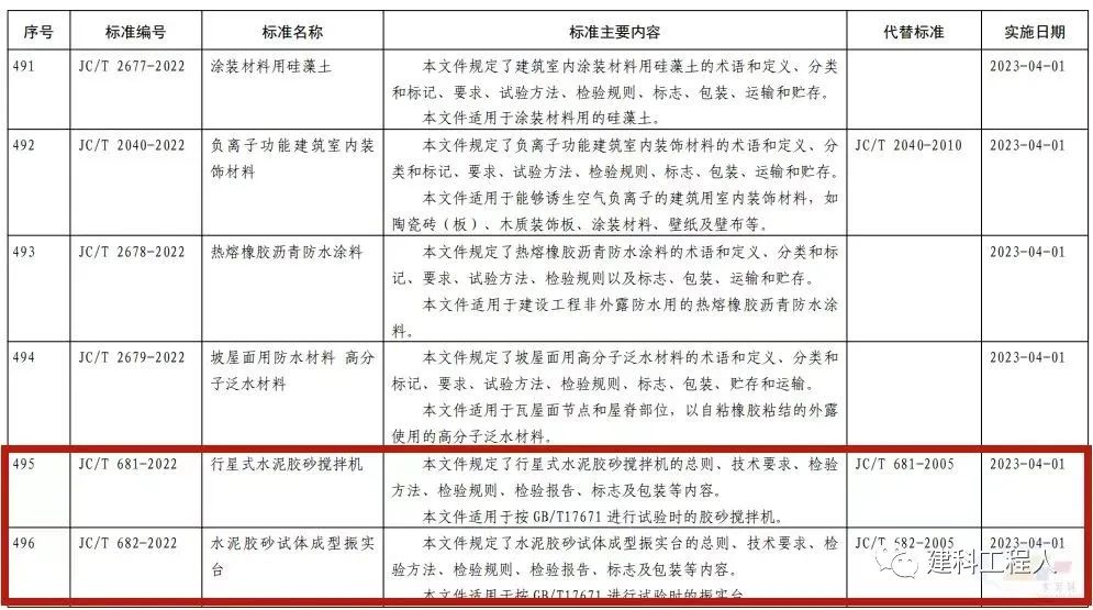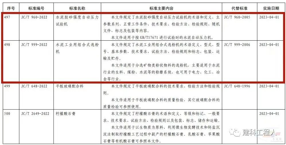 2022年10月20日,中華人民共和國工業(yè)和信息化部2022年第23號公告文件批準發(fā)布1036項行業(yè)標準,其中包含三項水泥膠砂強度檢驗試驗相關設備標準,分別為JC/T 681-2022《行星式水泥膠砂攪拌機》,JC/T 682-2022《水泥膠砂試體成型振實臺》,JC/T 960-2022《水泥膠砂強度自動壓力試驗機》,三項標準將于2023年4月1日實施。